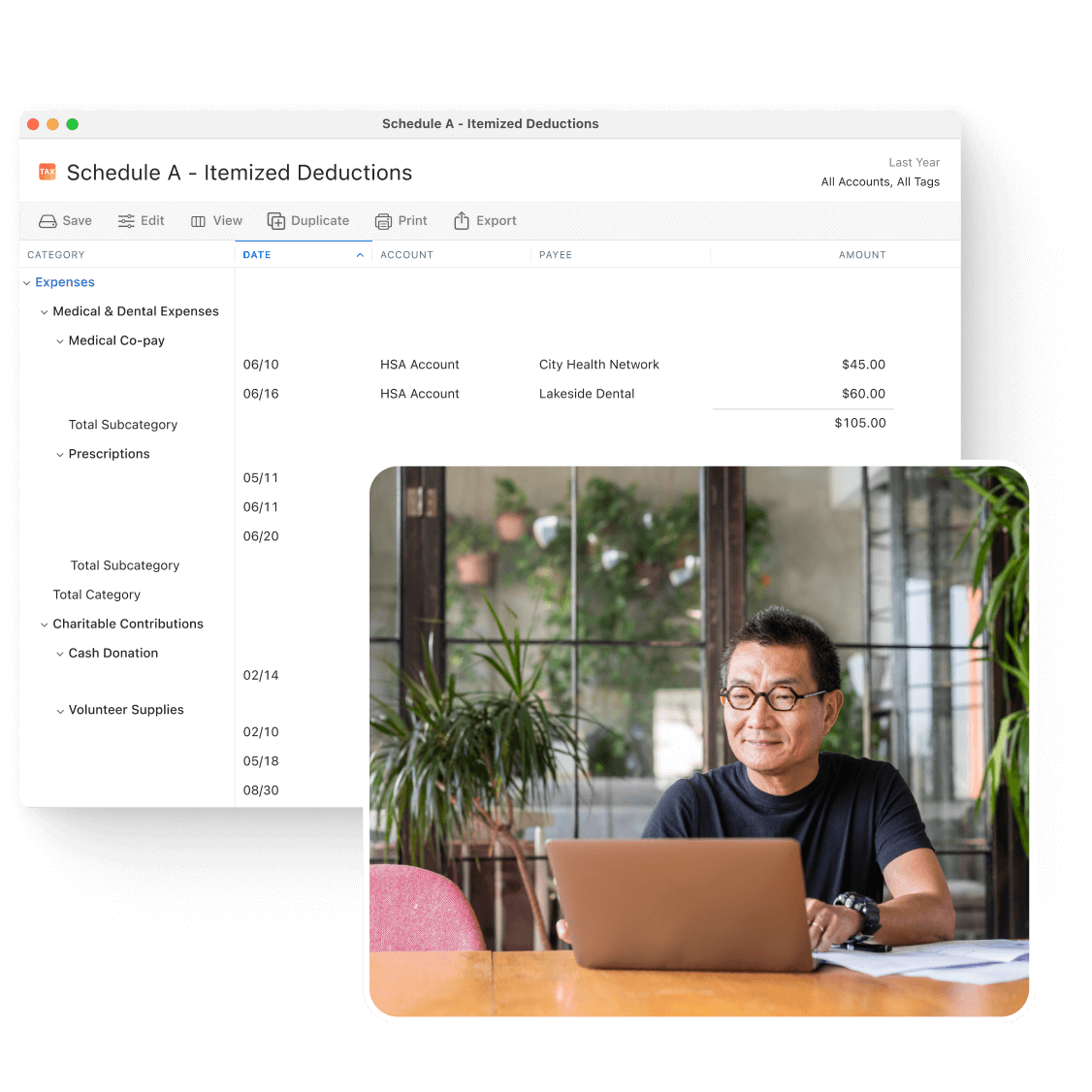 Quicken handles Schedules A–F* and exports to your tax software — no manual entry needed. Tag expenses as you go and use built-in tools to fine-tune withholdings, find deductions, and boost your refund.