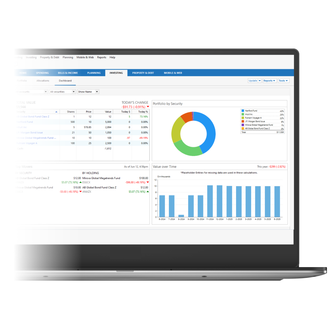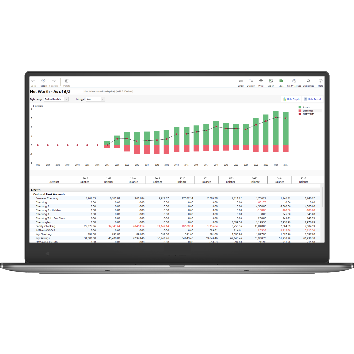 With data from your connected accounts, Zillow integration for your home, and manual add for any other asset or liability, Quicken Classic gives you a complete picture of your net worth that you can track over time.