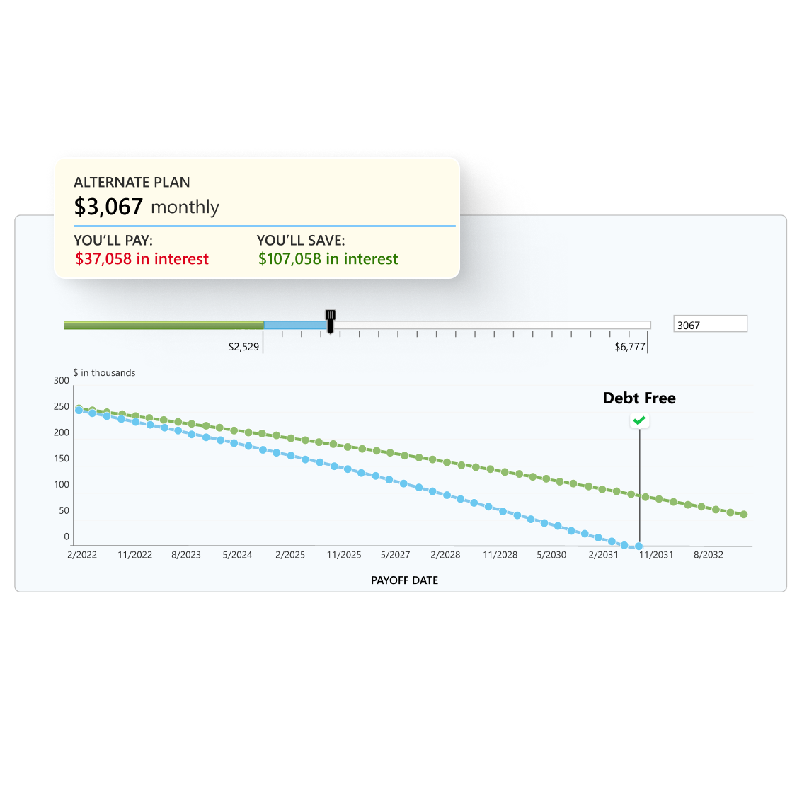 Create a debt strategy that works for you with Quicken’s dynamic “what-if” tools & calculators. Compare payoff scenarios that account for interest, due dates & goals, so you can pay it off, continue saving, & keep looking ahead.